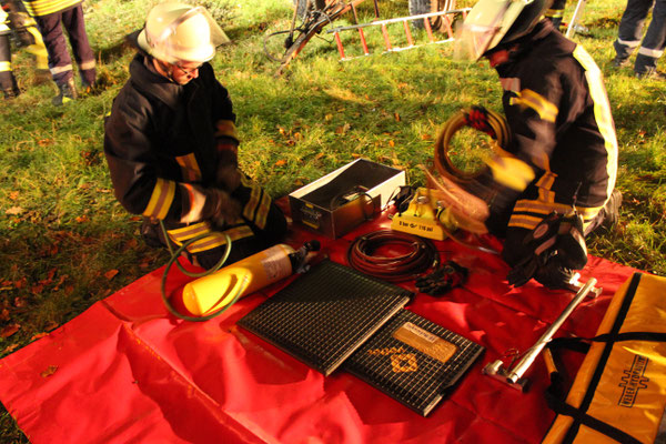 haben. Mit zwei großen Hebekissen wurde der Oberkörper der Person entlastet. Zur Sicherung und weiteren Entlastung setzte man den Greifzug ein, um die Person dann endgültig aus der misslichen