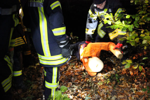 können. Die Schwierigkeit bestand darin, dass das Gelände sehr unwegsam war und die Rettungsplattform mit den Holmverlängerungen ausgeglichen werden musste, um eine sichere Arbeitsfläche zu